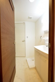 廊下左手がサニタリールームになっています。段差も無く、移動もスムーズです。左手手前が、洗濯機置場、左手奥が洗面台。右手の奥がバスルームになっています。