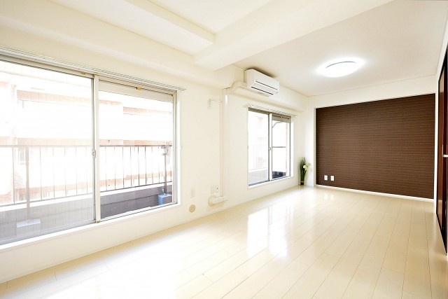 こちらは、玄関の正面に位置します約6.3帖の洋室です。南東の壁一面が開口部になっていて明るいお部屋。