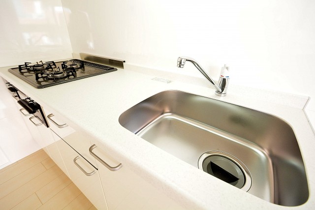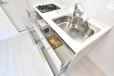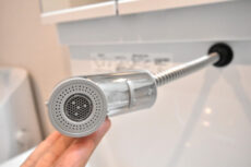 コンロは2口、グリル付き。グリルは魚イメージが強いと思いますが、他にも様々なお料理に使えるらしいですよ。ご興味がある方は是非調べてみて下さい。水栓は浄水機能一体型。切り替えるだけで美味しいお水を気軽に使うことが出来ますよ。