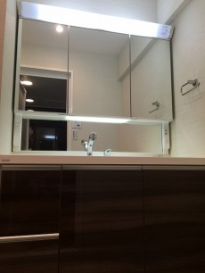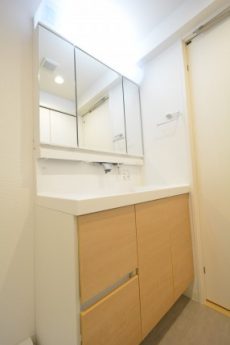 洗面化粧台は身だしなみチェックに便利な三面鏡付き。上部に照明が付いて鏡を開いた時に影になることもありません。水栓が上に付いていてお掃除がしやすいのもいいですね。