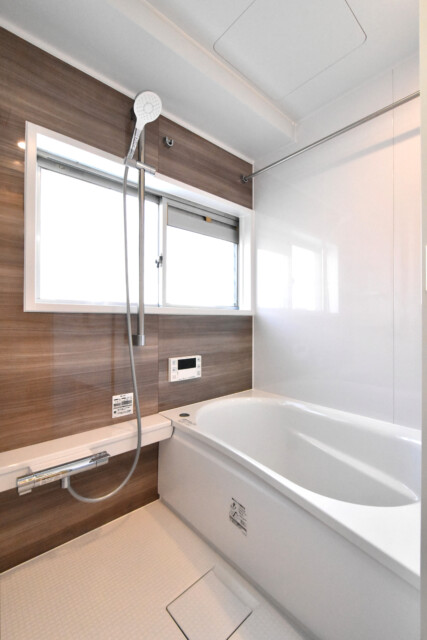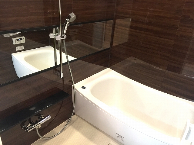 バスルームは、高級感のある落ち着いた木調のパネル☆ゆっくり大きなバスタブにつかって疲れを癒せそうです♪♪