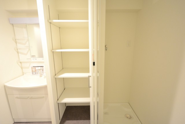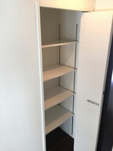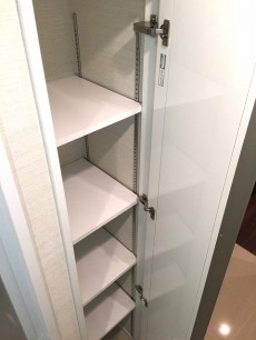 バスルームの扉の横には可動式棚の収納があります。リネンの収納にもってこいですね (●´∀`)