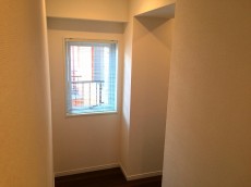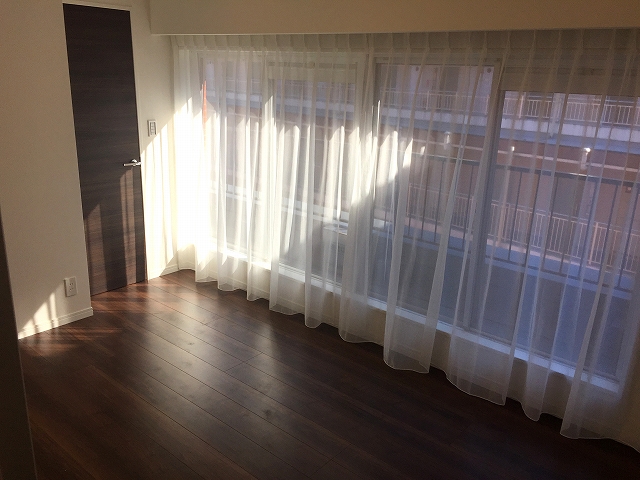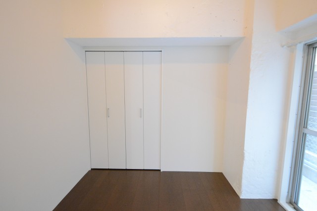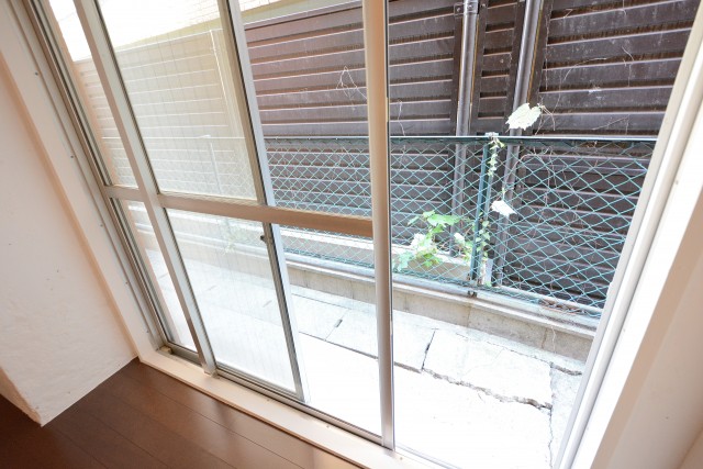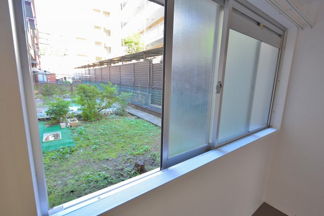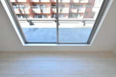 窓にはフィルムが貼られて閉めていれば外からは見えないようになっています。外はこの部屋のルーフバルコニーとはいえ窓を開ける時は十分注意しましょう!換気用の小窓を利用するのもいいと思います。