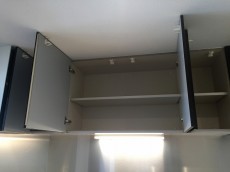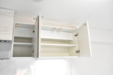 収納は吊戸棚と調理台下のスライドキャビネット。スライドキャビネットは出し入れしやすく奥の方まで確認しやすいのが特徴です。吊戸棚は梁の関係で上の段があまり役に立ちませんが、元々活躍するのは下の段。ラップや即席スープ、ティーバッグなどを入れる、個人的には使用頻度の高い場所です。