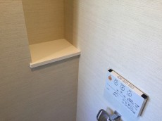 トイレは扉などがないタイプ。慣れるまで落ち着かないかもしれませんが、一人暮らしならトイレのドアなんか閉めないという方も多いと聞きますからきっと大丈夫ですよ(笑)掃除道具の収納やトイレットペーパーのストックに便利な吊戸棚も付いています。INAX製の洗浄機能付き。洗濯機スペースにも棚が付いているので洗剤などのランドリー用品はこちらへどうぞ。