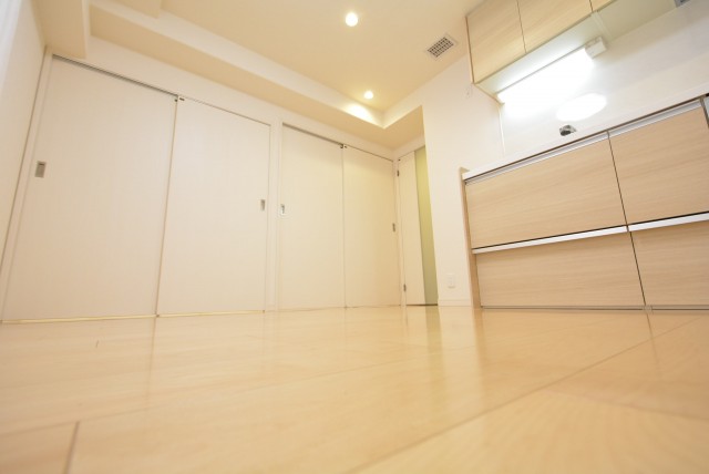 リビングダイニングキッチン入ってすぐのところにクローゼットが設置されています。普段使いの物などはこちらにすべて収納できそうです♪♪急なお客様の時でも生活感を隠せてgood☆インターフォンはTVモニター付きで、セキュリティもバッチリ♫