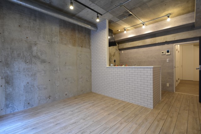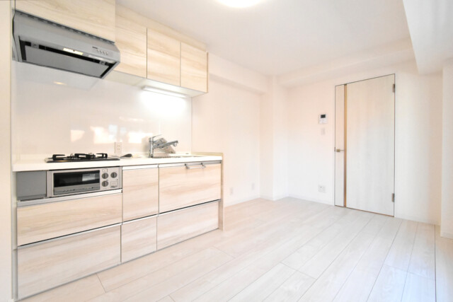 最近はカウンターキッチンが人気ですが、省スペースという点では断然優れているのがこの壁付けキッチン。キッチン内が丸見えという欠点がありますが、キレイにしておけば何の問題もありません。調理台はお部屋に馴染むようフローリングに合わせた木目パネルを使用。調理台の横には冷蔵庫やカップボードが並ぶ感じになると思います。