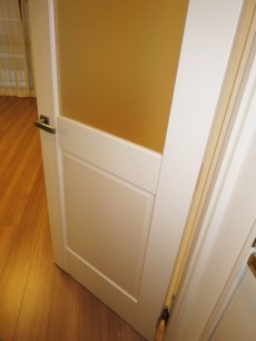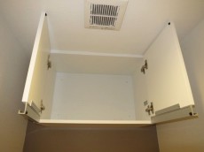 化粧台となり・洗濯機置き場上部には吊戸棚が設置されていました。洗剤や
