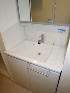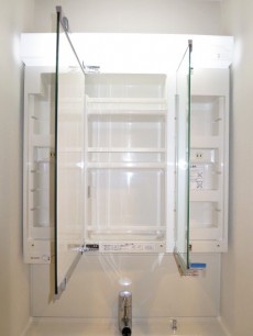 洗面化粧台は身だしなみを整えるのに便利な三面鏡付き。裏がキャビネットになっているので、洗面周りに散らかりがちな細々した物もスッキリと片付けることができますよ。
