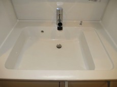 こちらもホワイトで統一された洗面化粧台。洗面ボウルは継ぎ目のないタイプで、
