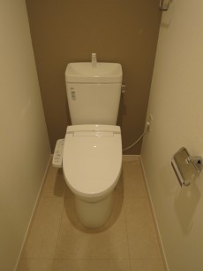 TOTO製の温水洗浄機能一体型。トイレットペーパーや掃除道具などの収納に便利な吊り戸棚も付いています。