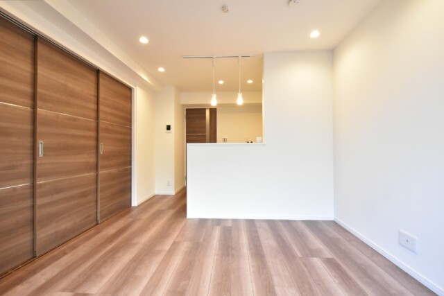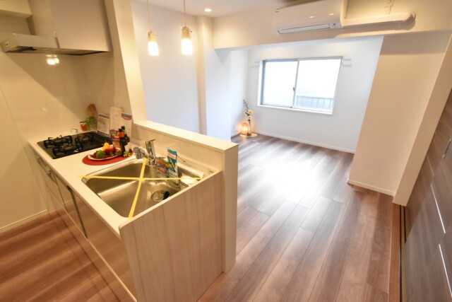 キッチンからLDKと洋室を見渡すことができます。広いLDKとして利用するイメージが沸いてきます。