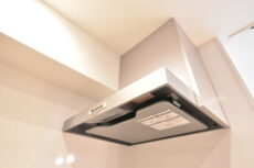 グリル付の三ツ口ガスコンロに薄型のレンジフードです。