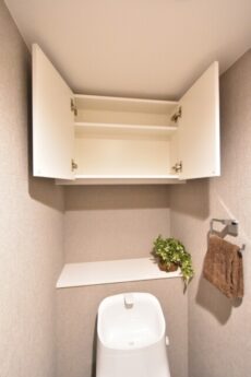 上部に吊戸棚。後方部がカウンターになっています。棚にはストック品、カウンターはちょっとしたインテリア等を置けばトイレに癒しがプラスされます♪