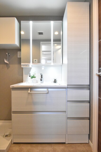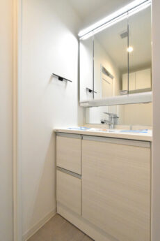 洗面室には洗面化粧台の他に洗濯機スペースと浴室があって脱衣所も兼ねています。洗面化粧台には身だしなみのチェックにあると嬉しい三面鏡付き。上部に照明も付いているので影になることもありませんよ。洗濯機スペースの吊戸棚には洗剤などのランドリー用品を収納可能。