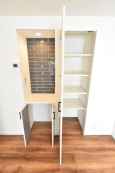 吊戸棚付き洗濯機スペース、洗面台、リネン庫です。
