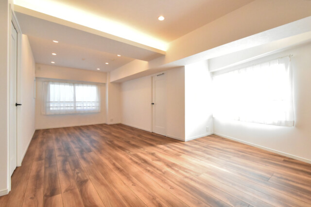 約19.2帖!これは広いですね!南東・南西の二面採光で明るいのはもちろん風通しの良さそうなお部屋です。自然の木目を生かした濃いめのフローリングと壁天井の白とのコントラストでより広く感じるのかもしれませんね。