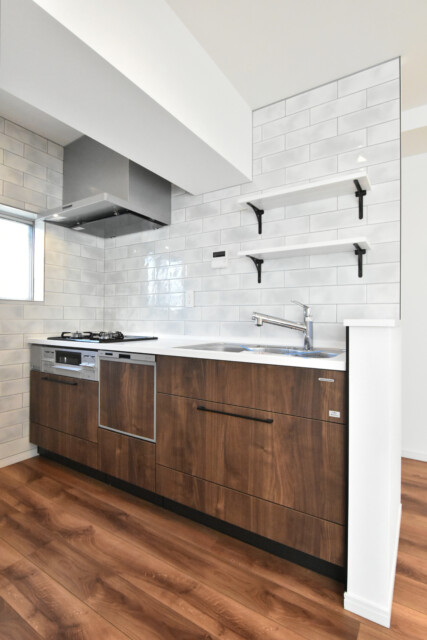 壁付けタイプは場所をとらないという長所がある反面キッチン内が丸見えになってしまうという短所も持ち合わせていますが、こちらのキッチンはリビングダイニングに対して横向きに設置されているのでその心配がありません。調理台にはお部屋の雰囲気に合わせたダークブラウンの木目パネルを使用。