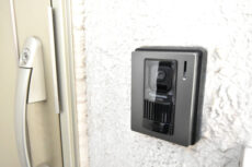 着きました!モニター付きインターフォンが設置されています。早速、ダブルロックの玄関ドアを開けて見ましょう。こちらは、軽い力で開けることのできるドアです。