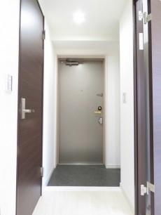 右側にトイレ、洗面室、左側に洋室、正面にダイニングキッチンの扉があります。