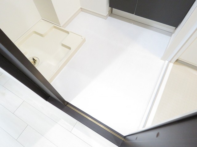 トイレのお隣は洗面室。洗面化粧台、洗濯機置場、バスルームが脱衣スペースを囲むように配置されています。白基調で清潔感たっぷり。