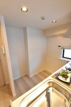 キッチンカウンターの背後は冷蔵庫置場と食器棚置場が確保されています。