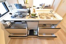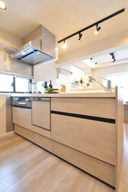 キッチンはカウンタータイプ。開放的で、お料理中でもリビングダイニングとコミュニケーションをとりやすいのが特徴です。システムキッチンはナチュラルな木目パネルでお部屋との統一感もバッチリ。食器洗浄乾燥機や浄水器一体型水栓などの便利機能ももれなく付いています。