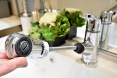 キッチンの水栓は浄水器一体型。ワンタッチで水道水が美味しい浄水に切り替わります。ノズルも伸びて、シンクのお掃除などにとても重宝します。