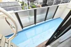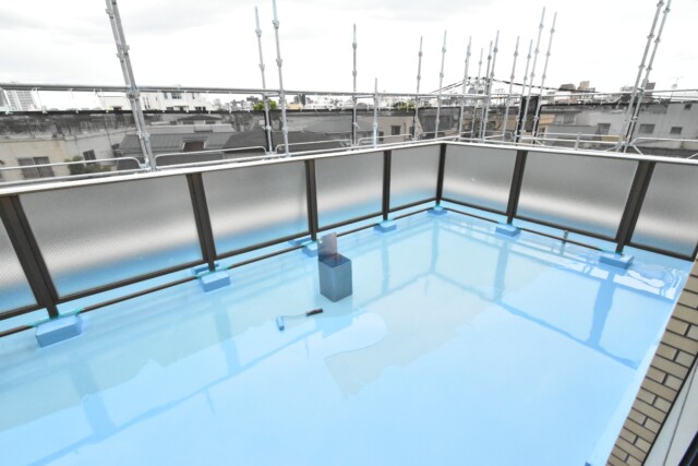 バルコニーへは工事中で出られませんでした。床のブルーの塗装は防水だそうで、最終的にはグレーがかったベージュになるそうですよ。