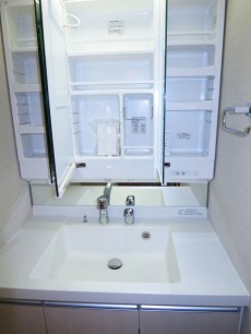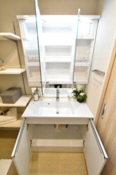 洗面化粧台の三面鏡の裏は全て収納としてお使いいただけるようになっております。