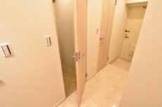 洗濯機置場上部には吊戸棚、洗面化粧台横には可動棚がありました。可動棚にタオルを綺麗に畳んで置いておくと、まるでホテルのような雰囲気になりそうです!