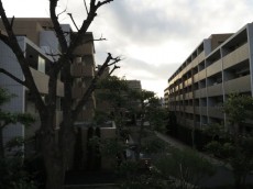 現在こちらのマンションは大規模修繕工事中です。ご覧の通り、足場が組まれています。外部廊下沿いに足場があるので、廊下と外部の関係が伝わりづらいかもしれません…