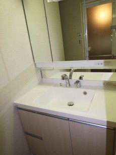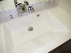 継ぎ目のない洗面ボウルが美しい洗面化粧台。スポット照明がないのでかなーり