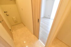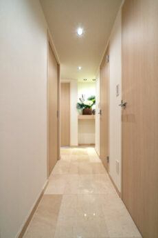 玄関から廊下にかけては大理石貼り!大理石とか冷たい印象なりがちですが、ナチュラルカラーの建具に合わせた温かみのある色合いで柔らかい雰囲気の空間になっています。
