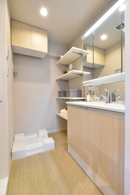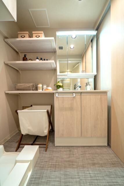 洗面室には洗面化粧台、洗濯機スペース、収納棚、浴室がまとまっていて脱衣所を兼ねています。洗面化粧台は三面鏡付。裏がキャビネットになってるので、洗面周りの細々としたものもすっきりと片付きますよ。可動式の収納棚には、リネンや洗濯関係の物など使い道が多そうです。ランドリーバスケットを置くスペースがあるのも嬉しいですね。