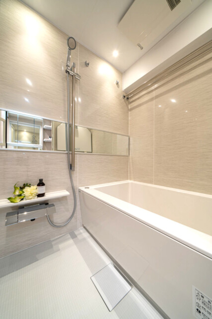 洗面化粧台の向かいには浴室があります。アイボリーの大理石調パネルが高級感を醸し出しています。お風呂時間が楽しみになりそう!