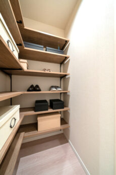 玄関にはシューズインクローゼット。靴が大量に入るのはもちろん、靴以外の物を収納するのにも便利です。特にクローゼットなどにも入らない背の高い物