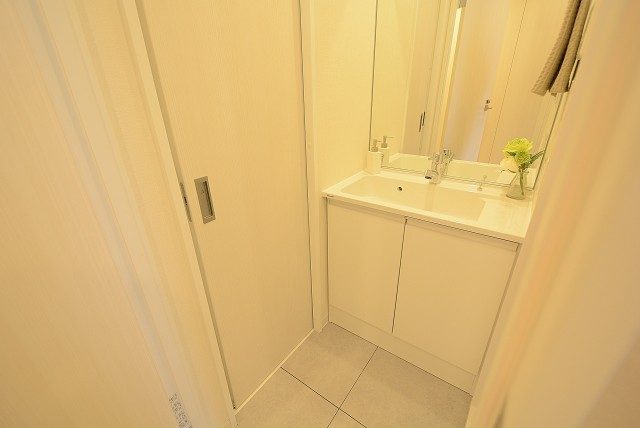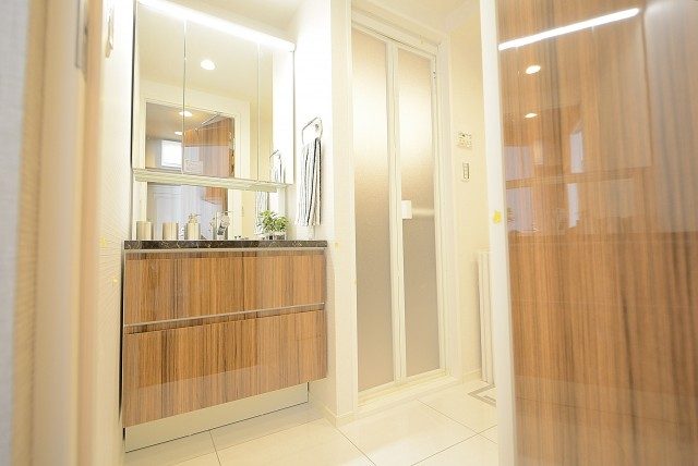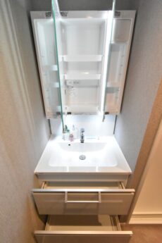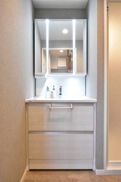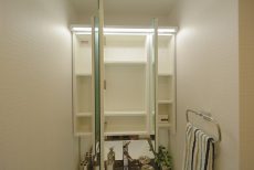 【洗面室:三面鏡付き洗面台・洗濯機スペース・浴室】