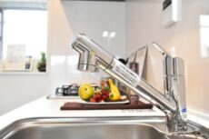 水栓は浄水機能付のシャワーヘッド。お料理にも惜しみなく浄水を使っていきましょう!