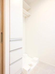 【洗面室:三面鏡付き洗面化粧台・洗濯機スペース・リネン庫】