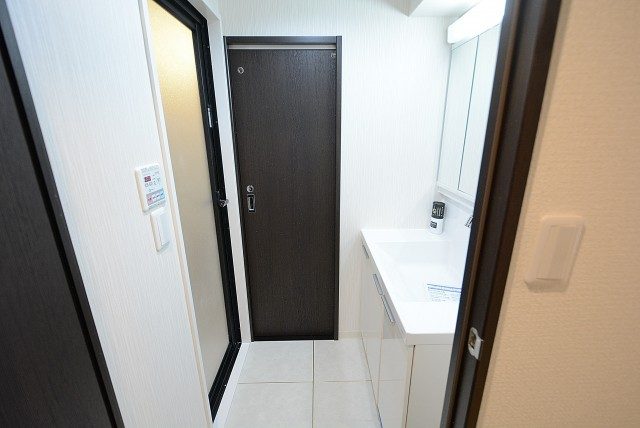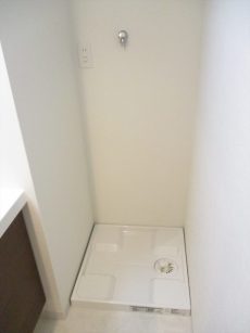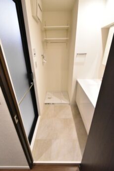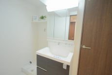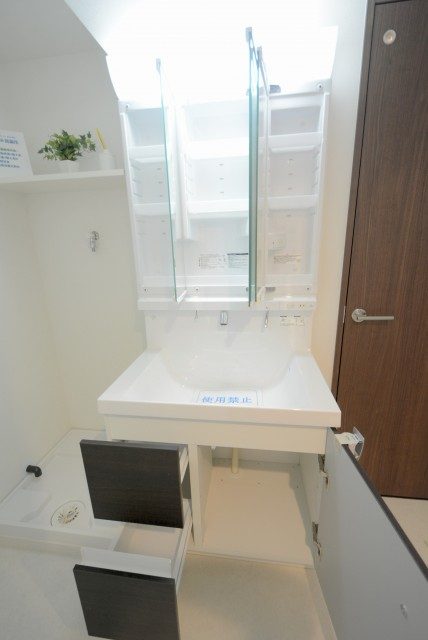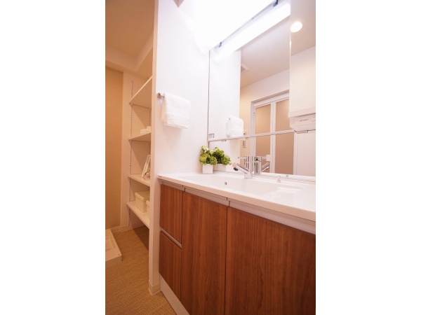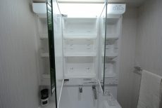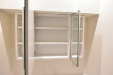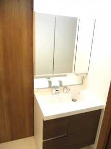 【洗面室・三面鏡付き洗面化粧台・洗濯機スペース】