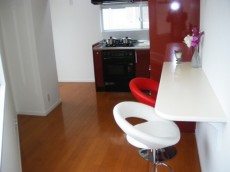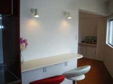 一部壁面にはタイル調のアクセントクロスがあしらわれ、カウンター&スポット