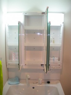 三面鏡の裏はキャビネットになっており、こまごました日用品をすっぽり
