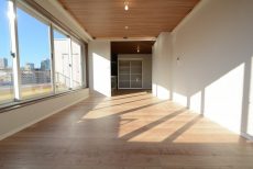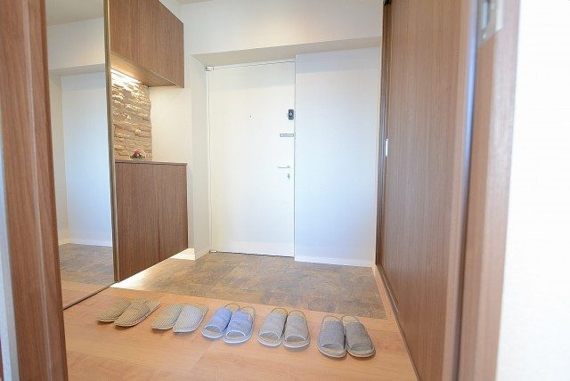 お~広いですね!さすが100㎡超!玄関や廊下を削ってお部屋を少しでも広く…なんて必要もありません。ゆとりのある玄関ってやっぱり高級感ありますよね。入口のドアはクラシカルなマンションに多い内開き。海外では防犯上の理由などから内開きが主流だったので、初期のマンションは内開きが多いのだそうです。ただ、日本は靴を脱ぐ文化があるのと家が小さいことから現在は外開きの方が多くなったとのこと。