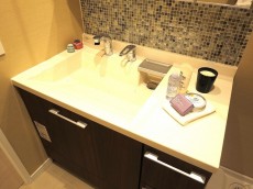 幅の広い洗面台はボウルも大きですが、ボウル横に幅がありカウンターになっていて使い勝手が良さそうです。