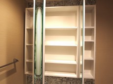 ミラーの内部は収納スペースになっているので、歯ブラシや基礎化粧品などの小物はこちらに収納してくださいね!