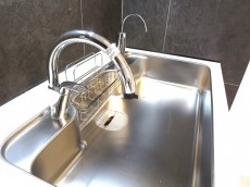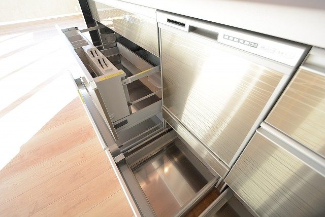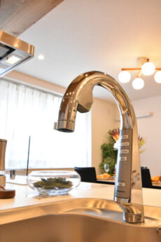 食器洗浄乾燥機完備!食器洗いから解放されるので、食後はみんな揃ってのんびり過ごせますよ。水栓はタッチレスの浄水機能一体型。手が泡だらけでも問題なし、触らないので衛生面でも安心です。グースネックがオシャレ♪