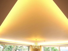 折り上げ天井の間接照明で雰囲気のある空間に。調光も可能です。