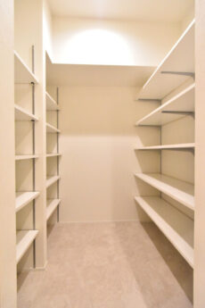 ハンガーパイプや収納棚が付いた約2.5帖の広い収納です。衣装ケースなどで収納力をアップさせたり、季節もの家電やスーツケースなどのかさばるものの収納にも使えそうですね。