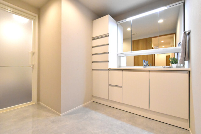 ミラーキャビネットをはじめリネン庫など収納豊富!洗面周りの細かいものから大きなものまでバランスよく収納しておけますよ。